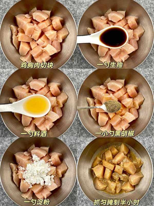 將雞身材肉切成適當大小的塊,放入鹽、黑胡椒粉、生薑、大蒜粉等調味品中醃制20分鐘。