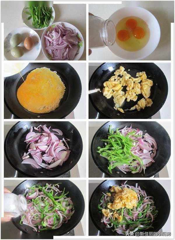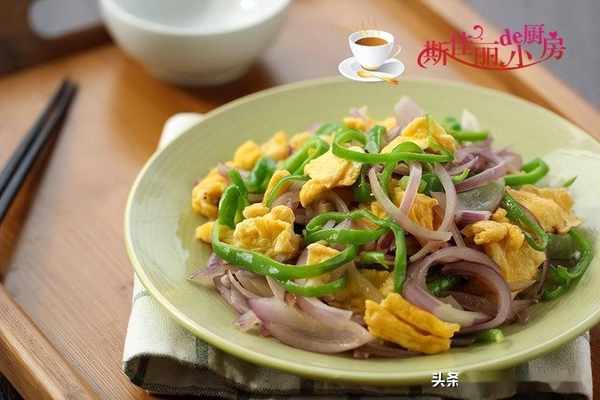 制作: 雞蛋中加入少許鹽和料酒(這是幫助雞蛋去腥), 將雞蛋打散備用;燒熱鍋放入少許油, 倒入雞蛋液炒微微定型後用筷子劃散成小塊後盛出備。鍋中留少許油, 將洋蔥絲放進鍋中翻炒出香味,加入青椒絲翻炒至微微變色, 再加入少許鹽調味,最後倒入炒好的雞蛋進去翻炒均勻。
