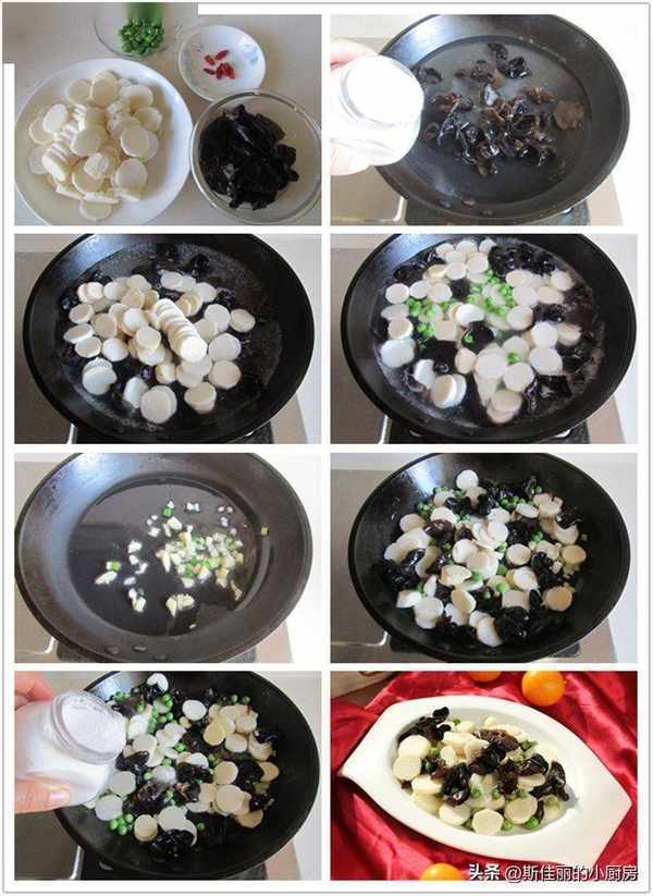 制作:提前用冷水將黑木耳泡軟, 燒鍋水加入少許鹽, 將泡軟的黑木耳放進鍋中焯一分鐘;再將鐵棍山藥片放進鍋中焯煮一分鐘,加入少許青豆進去焯煮熟後撈出備用。燒熱鍋放入少許油, 將少許蒜末放進鍋中爆香, 再將焯好的木耳和山藥片放進鍋中幾下,再加入少許鹽調味翻炒均勻即可。