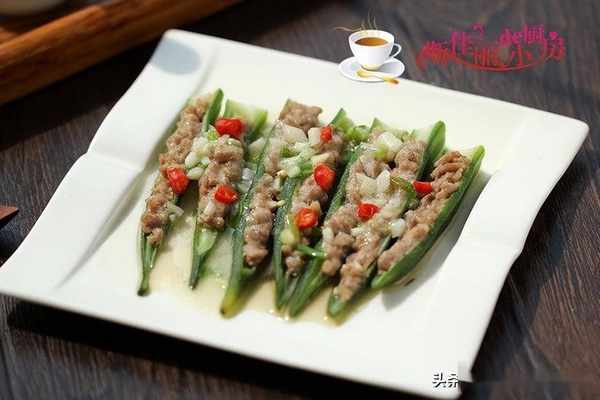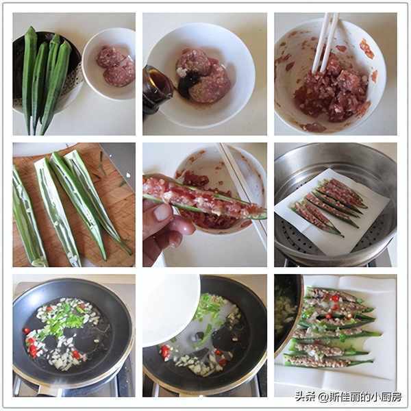 原料: 秋葵 肉末 蔥薑蒜 紅辣椒 薑末 料酒 蠔油 淀粉 油鹽