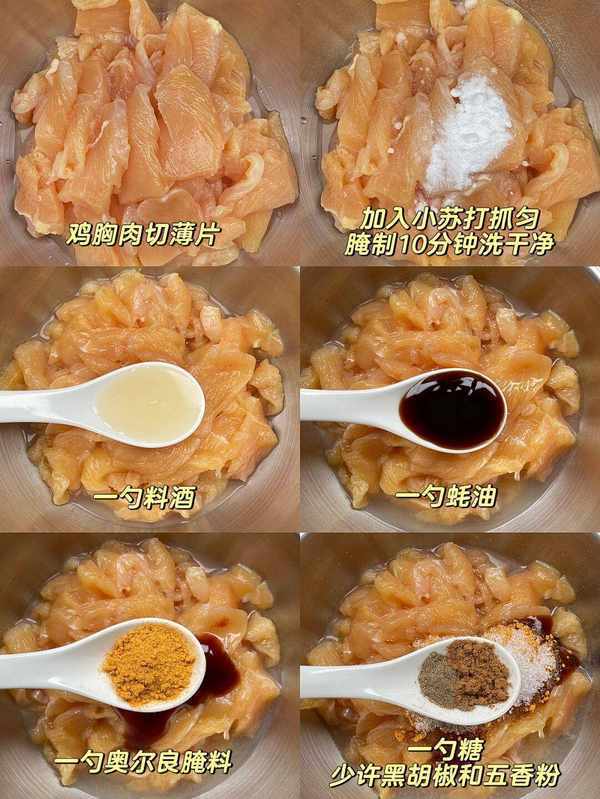 1.雞身材肉切成約1cm厚的片狀,撒上適量的鹽和黑胡椒,醃制10分鐘。
