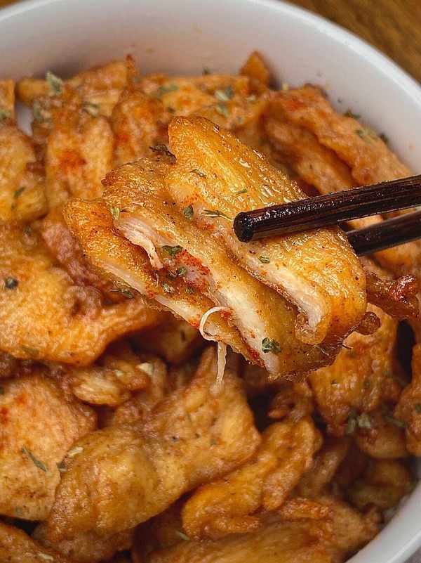雞身材肉要切成均勻的薄片,這樣可以確保炸制出的雞身材肉片的熟度均勻。