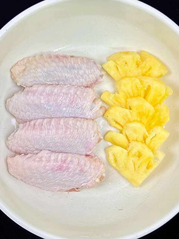 (1)準備工作:將雞翅清洗幹凈,去除多餘的骨頭和皮,切成小塊;菠蘿去皮切成小塊備用。