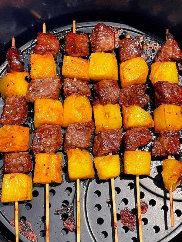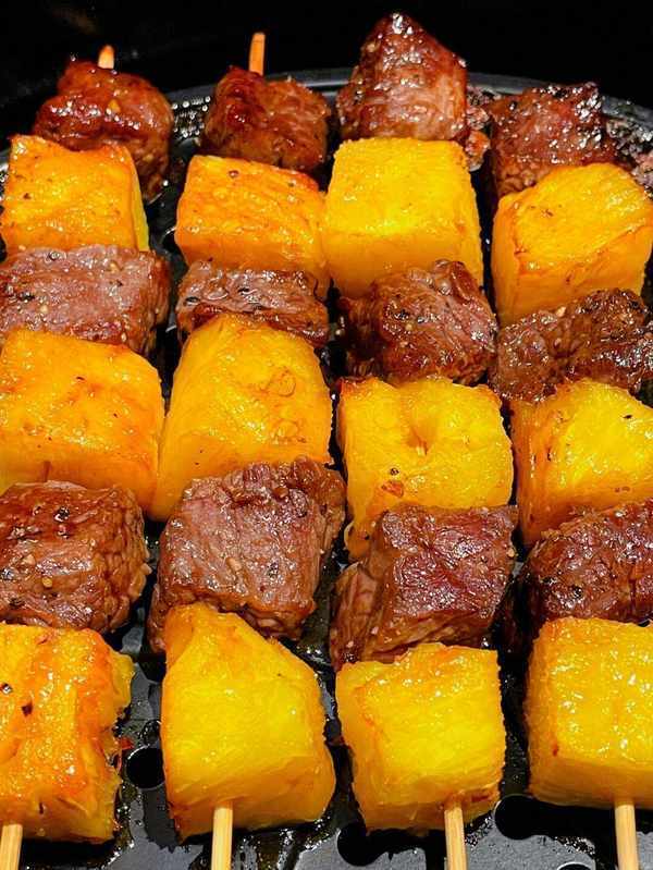 烤制時火候要掌握好,適當加蓋,翻動時可用刷子沾一些油塗抹在牛肉和菠蘿上,讓其表面更加光滑,並增添一份香氣。