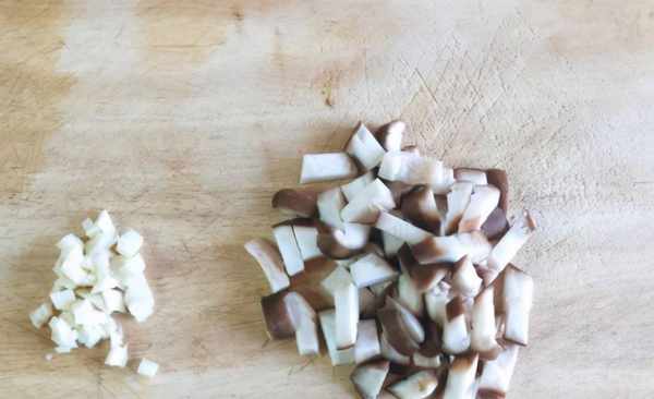 2、把清洗幹凈的香菇切成小丁,不喜歡吃香菇丁的朋友也可以把香菇切成薄片,蒜瓣切成蒜末備用。