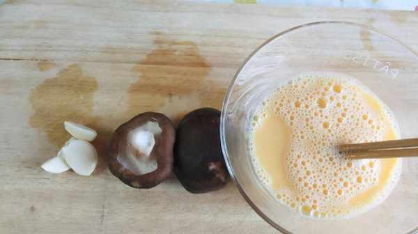 1、準備好香菇和雞蛋,香菇清洗幹凈,蒜瓣剝好皮,把雞蛋打入碗中用筷子打散,如果傢裡有打蛋器也可以用打蛋器把雞蛋打散,但是用打蛋器的時候切記要開低檔,不要開高檔,如果開高檔,可能一不留神就會把雞蛋打發。