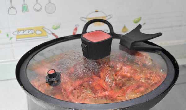 第八步蓋上蓋子用中火燜小龍蝦,燜15分鐘大火收汁,放入蒜蓉炒勻,撒上蔥段即可。