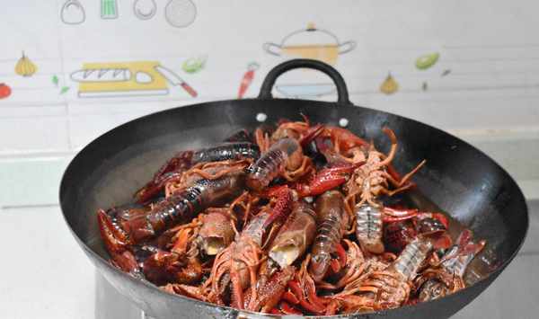 第五步放入小龍蝦繼續炒兩三分鐘,把小龍蝦炒至轉色。