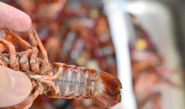 第二步小龍蝦去掉部分頭部,用水沖洗一下,用刷子刷幹凈小龍蝦的頭部和腹部,小龍蝦的腹部很臟,要刷幹凈再沖洗。