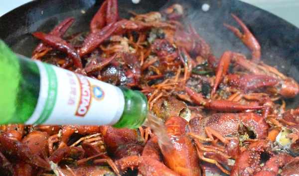 第七步把調味料和小龍蝦炒勻,加入一瓶600毫升啤酒。