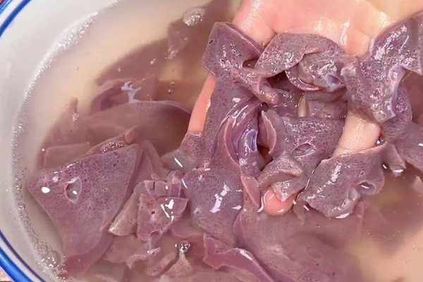 2.再備一塊新鮮的豬肝,先切成薄片,再放入碗中,加入高度白酒和面粉,用手不停抓拌,再倒入清水,將血水沖洗幹凈,這樣洗過的豬肝吃起來才沒有腥演技味。