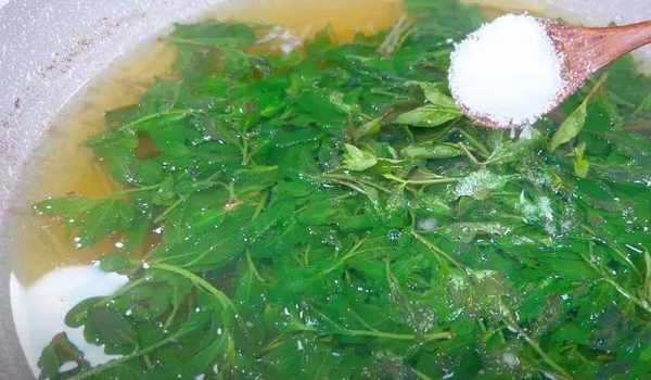 4.倒入枸杞葉,大火煮軟煮變色後,開始調味,調味也很簡單,隻需要放適量食鹽、一小勺味精、一小勺胡椒粉,攪拌均勻。
