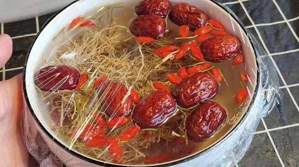 3.接著又將養肝草用剪刀剪碎,裝入小碗中,這樣容易煮出味,再放入紅棗和枸杞,倒入沒過食材的開水,蓋上保鮮膜,放入蒸鍋,開小火隔水燉1個小時。