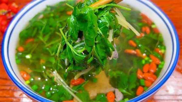5.最後放入幾粒枸杞,適量蔥花增香,即可出鍋,一道營養鮮美的枸杞葉豬肝湯就做好瞭,養肝排毒,肝臟越喝越健康。