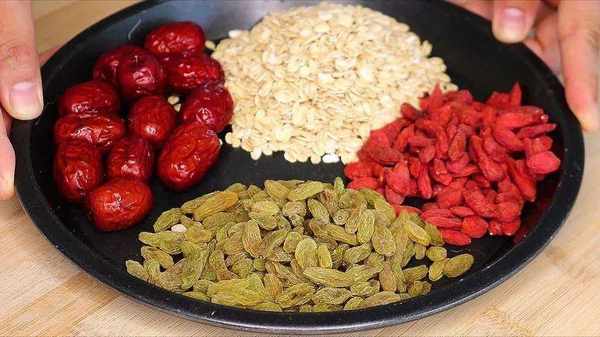 1.首先需要準備的食材有紅棗、葡萄幹、枸杞、燕麥。