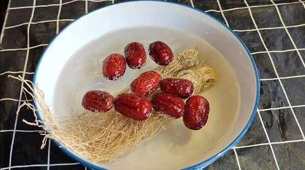 1.首先準備2小把養肝草,也叫絲線根、龍須草,是一種藥食同源的草本植物,接著再準備幾顆紅棗,裝入碗中,倒入適量清水,泡洗幹凈備用。