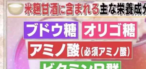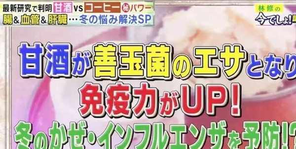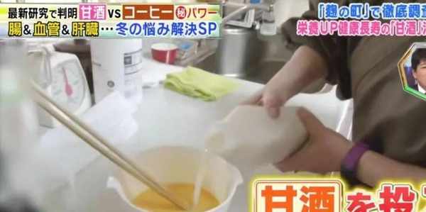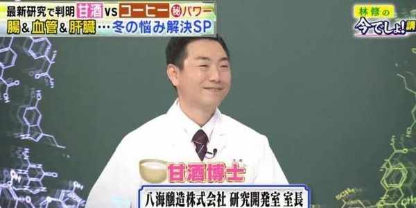 日本朝日電視臺於1月28日播出的教育性質節目——《林修的就是現在講座》中,以“甘酒驚人的power”為主題,也介紹瞭日本傳統飲品——甘酒的三大健康功效:有助身體健康、營養豐富容易吸收、美肌。