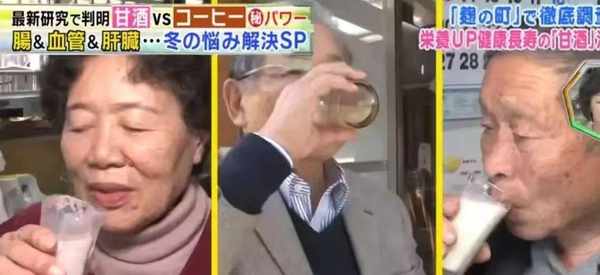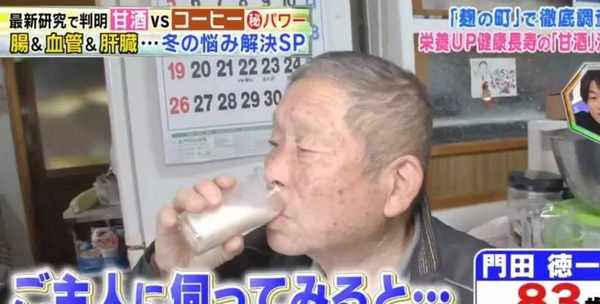 日本朝日電視臺教育性質節目《林修的就是現在講座》中采訪到瞭幾位日本老人,他們每天都會喝幾杯甘酒,身體也挺硬朗。而且因為米曲甘酒發酵過程簡單,不少人傢庭也都會自己做。
