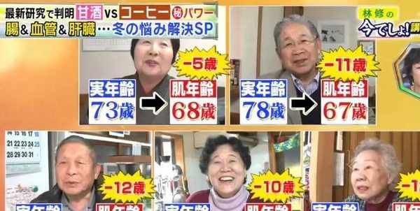 ③美肌:《林修的就是現在講座》中也給這些愛喝甘酒的爺爺奶奶奶們測瞭下實際皮膚年齡,都要比他們的年紀年輕。雖然說“年輕”是一個綜合因素,但飲食健康肯定也功不可沒。