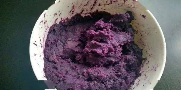 7. 紫薯泥和糯米粉,面粉和成光滑的團,如果太幹,慢慢的加清水。