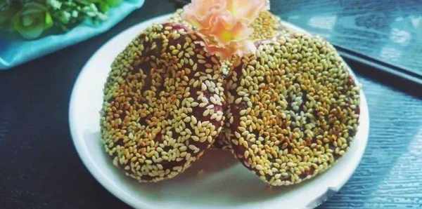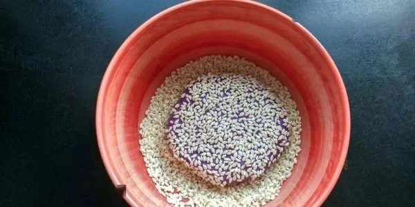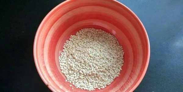 9. 取一小團紫薯糯米泥,按成圓餅,放入芝麻中,讓紫薯餅蘸上芝麻。