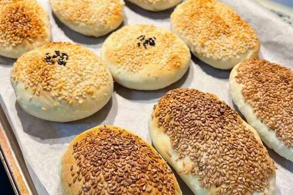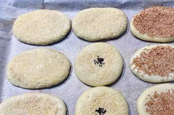 加入3-4小匙的糖餡,像包包子一樣的包起來,收口要捏緊。收口朝下,略整形後輕桿成圓形或橢圓形;烤箱預熱到170度;在面皮表面刷上水,沾上芝麻,排在鋪上烘焙紙的烤盤上。