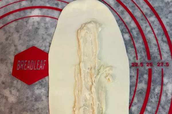 3、將燒餅面團稱重後分為10塊,每塊約@50~51g左右,依序壓扁後揉圓。松弛後的面團會變得很柔軟細致,從第一顆揉圓的面團開始桿,用桿面棍將面團桿成牛舌狀,並用湯匙在中間抹上油酥,四周都要留空間不要抹到,尾端那頭要特別留多一點空位,方便等一下的黏合,慢慢的把牛舌狀面皮卷起,邊卷邊將兩邊壓扁,最後再把收口處和兩端都完全捏合即可並依序完成10個面團。