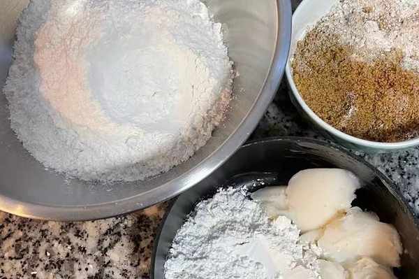 2、油酥的制作:可用豬油、無鹽奶油、玄米油….或任何一種傢裡有的油品做替換,隻是最好不要選擇味道過重的油。將兩者拌勻後,放冰箱冷藏,接著制作糖餡,秤好的材料混勻即可。取出面團,在工作臺上將面團揉成不沾手的均勻面團即可,燙面較柔軟,所以不需要過度的用力去揉,主要是要讓面團揉勻。揉好的面團用保鮮膜蓋住,松弛靜置。