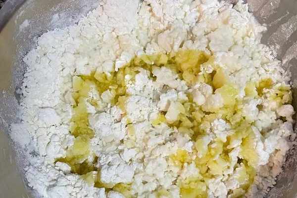 1、中粉與鹽秤在ㄧ起;低粉與豬油秤一起;糖與低粉秤一起,接著倒入滾水,邊倒要用叉子或筷子攪拌,讓面粉都能吃到滾水,拌好後的面粉就跟照片中一樣,再倒入冷水和油,並再次用叉子或筷子拌勻到看不到液體,將面揉成團,蓋起來休息一下,會更容易揉光滑。
