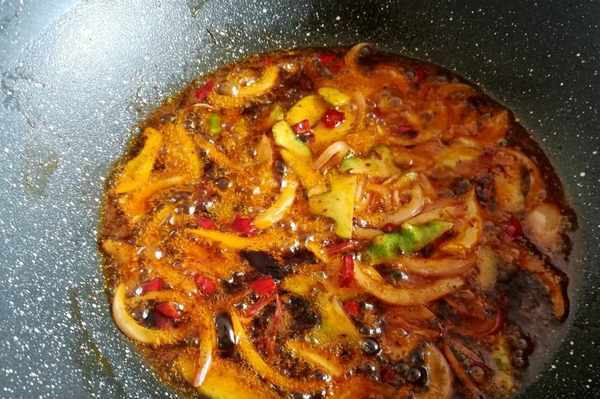 燒熱油鍋,放適量的食用油,放入生薑,洋蔥絲和幹辣椒翻炒出香味,放入火鍋底料翻炒出顏色。