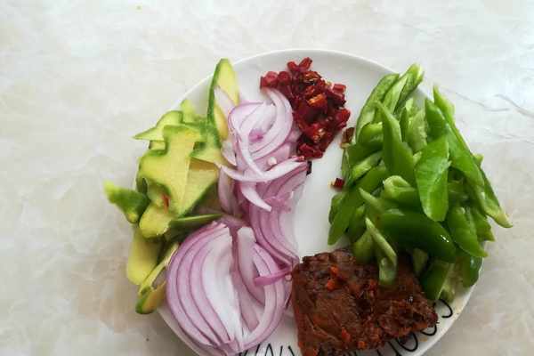 生薑去皮切薄片,洋蔥切絲,幹辣椒切小段,青椒斜著切小段,火鍋底料拿出來備用。