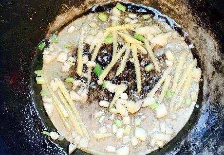 第四步,煎至肉變色,將事先炸好的豆腐放入鍋中,加入醬油、蠔油、胡椒粉和少許鹽,然後用豆腐蓋上水煮熟。絲瓜去皮,切成小塊;