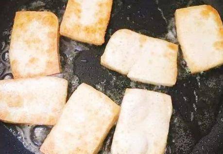 第二步,鍋裡加油。油燒熱後,放入裹好的豆腐塊開始翻炒。待豆腐兩面呈金黃色時,即可起鍋檢油待用;