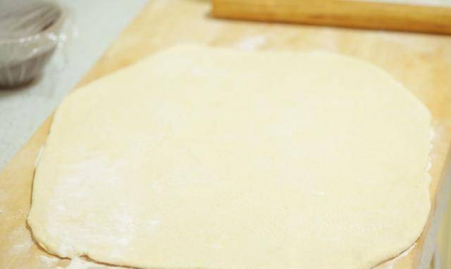 3.將做好的面團放在案板上,用搟面杖搟成薄薄的扁面包。