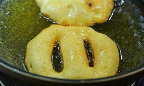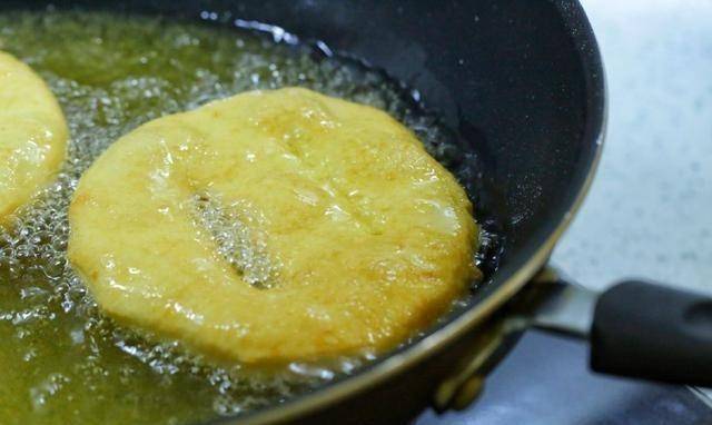 6.鍋裡油燒熱五分鐘,放入餅子,幾秒鐘後餅子就又肥又大瞭。這就是煎餅的制作過程。註意保持火焰介質。我選擇用花生醬,味道濃鬱溫和,炸出來的意大利面顏色也好看。