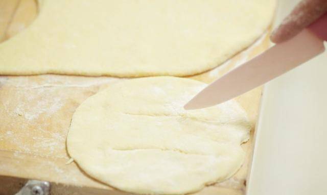 5、然後我們拿一把水果刀,在小圓餅的中間劃兩刀,這樣油炸後就變成瞭一個中間有空心的圓餅,吃起來會更加香脆可口。