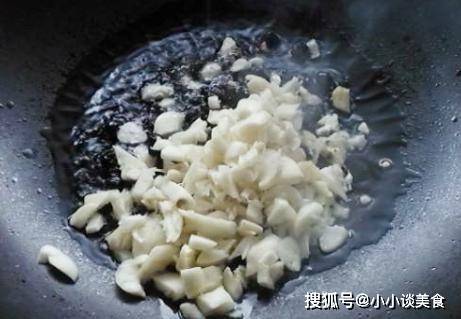 第三步是將菜莖浸泡約。10分鐘,然後撈出水,檢查裡面的水份,炒鍋中加入適量的食用油,將切好的大蒜放入冷油中,小火炒出蒜的香味;