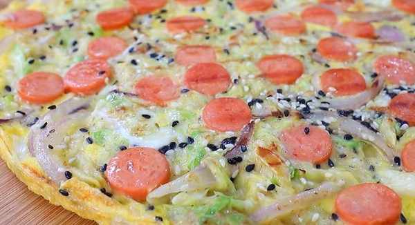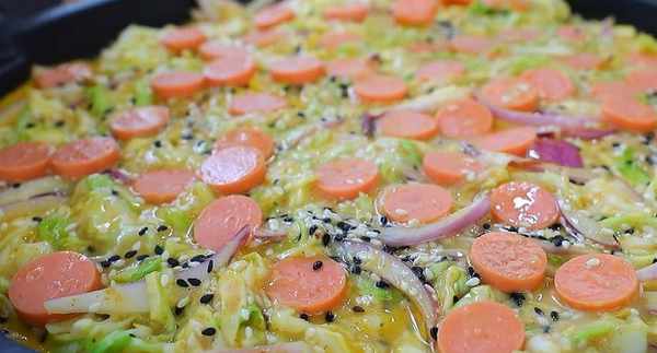 5.將火腿腸切成片,放入卷心菜餅上,繼續小火慢煎。煎至兩面金黃色,撒上芝麻調味,就可以裝盤出鍋瞭。
