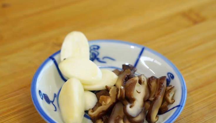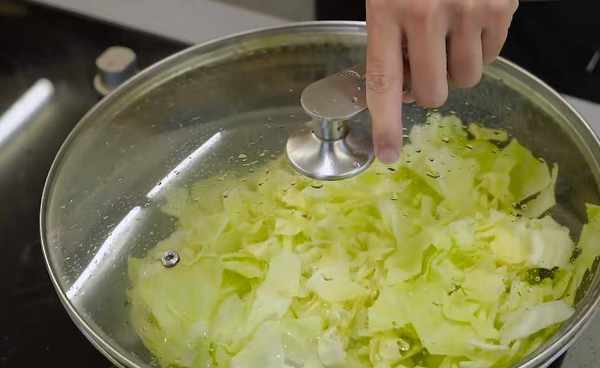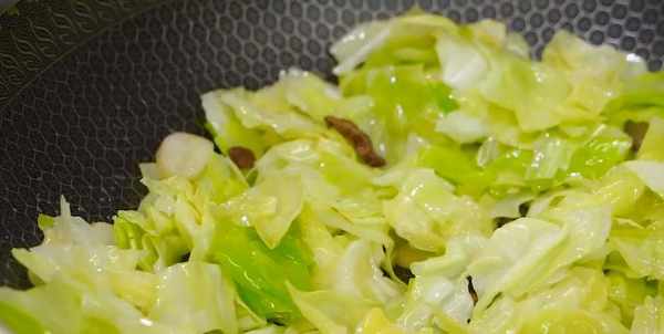 3.燒熱鍋後倒入油燒至六成熱,放入蒜片、香菇片炒香,再倒入卷心菜,蓋上鍋蓋燜十秒後,打開鍋蓋翻炒。