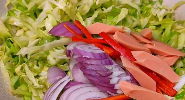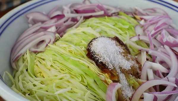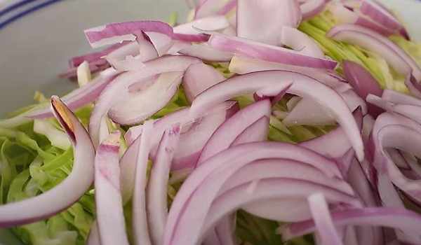 1.將卷心菜,洋蔥清洗幹凈,分別切成細絲備用。