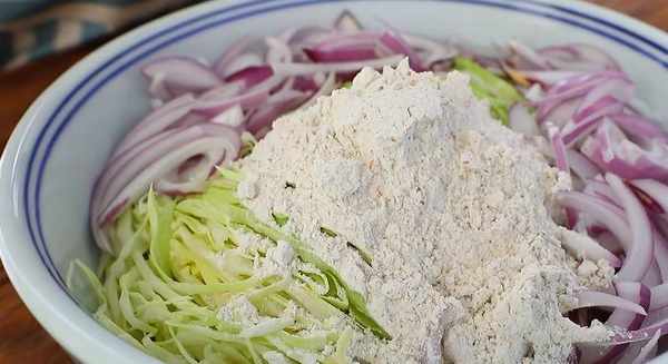 3.準備一個大碗,放入卷心菜絲,洋蔥絲、雞蛋液,加食鹽、蠔油、雞精、五香粉、一小碗面粉攪拌均勻。