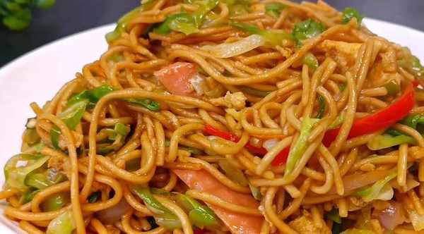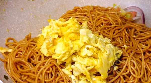 6.熱鍋冷油,倒入蔥、薑、蒜、卷心菜炒香,再放入面條雞蛋,加蠔油,食鹽,翻炒均勻,就可以盛出來裝盤瞭。