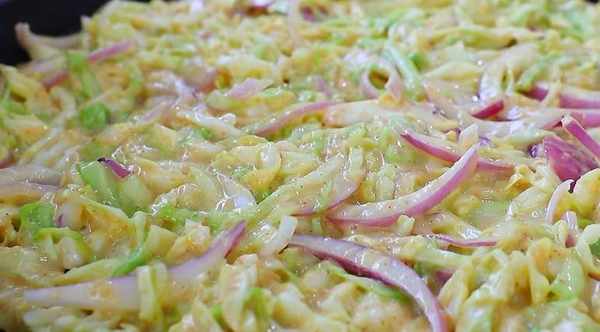 4.準備一個平底鍋,刷薄薄一層油,將卷心菜糊倒入鍋中,壓平,小火慢煎。