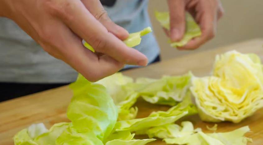 1.將卷心菜清洗幹凈,對半切開,去除硬梗,用手將卷心菜撒成小塊。