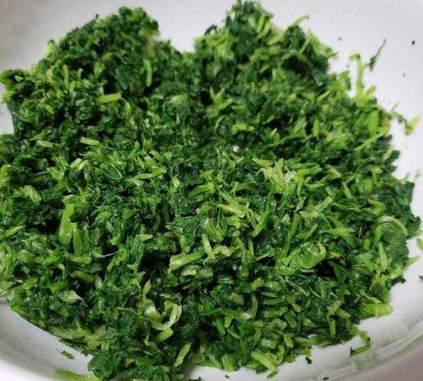 原料:面粉、白蘿卜秧、雞蛋、蔥、純凈水、花生油、橄欖油、鹽、五香粉、雞精。
