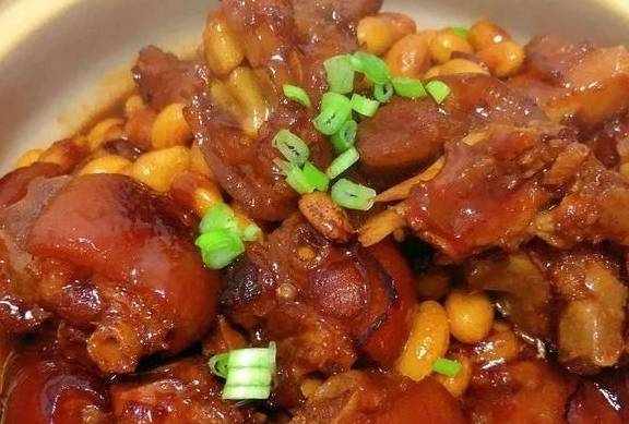 熱鍋冷油放入冰糖,小火炒制棗紅色,炒至冒小泡倒入豬蹄,翻炒上色,加入黃豆醬,蠔油,蔥,薑,八角,香葉,桂皮,幹辣椒翻炒,加入老抽,生抽上色,放入一包燉肉料,倒入一瓶啤酒適量開水,加十三香,鹽,胡椒粉,雞粉調味,在來一把山楂,中小火燉一個小時,加入黃豆,在燉30分鐘收幹湯汁,灑上青紅椒小蔥段裝盤上桌