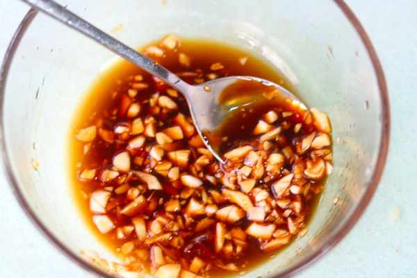 3、把糖醋蒜去皮,然後切成末,接著放入一點涼拌醬油,把它倒入盤子中。