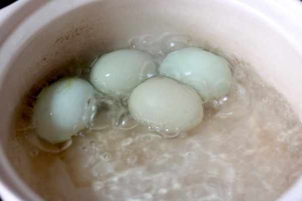 1、把雞蛋洗幹凈之後,放入到一個大碗中,然後開始煮,煮好之後,把它的外殼去掉。