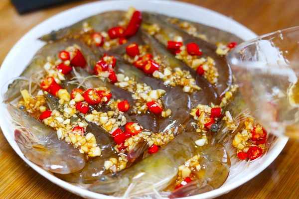 所需食材:大蝦適量、粉絲半把、蒜末、小米辣3個、薑末、鹽、生抽1勺、蠔油半勺