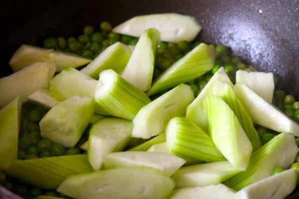 所需食材:絲瓜1根、豌豆適量、植物油、蒜末、鹽、雞粉2克